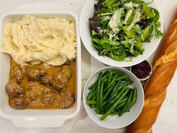 Hot: Swedish Meatballs, Mashed Potatoes, Field Greens & Fresh Bread